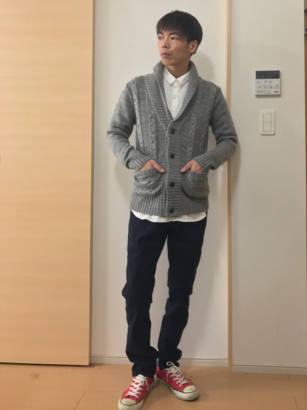レッド系のスニーカーを着用したメンズの冬コーディネートの1枚目の写真