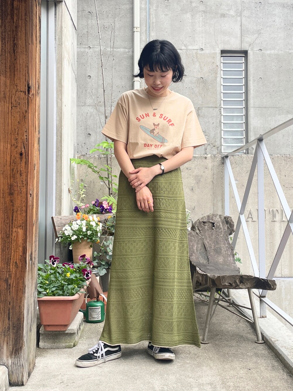 アイレット柄スカート履いてみました。 透け感のあるニットがかわいい、、! そして見た目よりもさらっと軽い履き心地で、ウエストもゴムなので楽ちん! Aラインのシルエットがきれいなので、こんなふうにTシャツ合わせるだけでコーデ完成しちゃうのが嬉しいところ◎ 大人なスカートに、レトロポップなワンちゃんプリントのバランスが好みです!