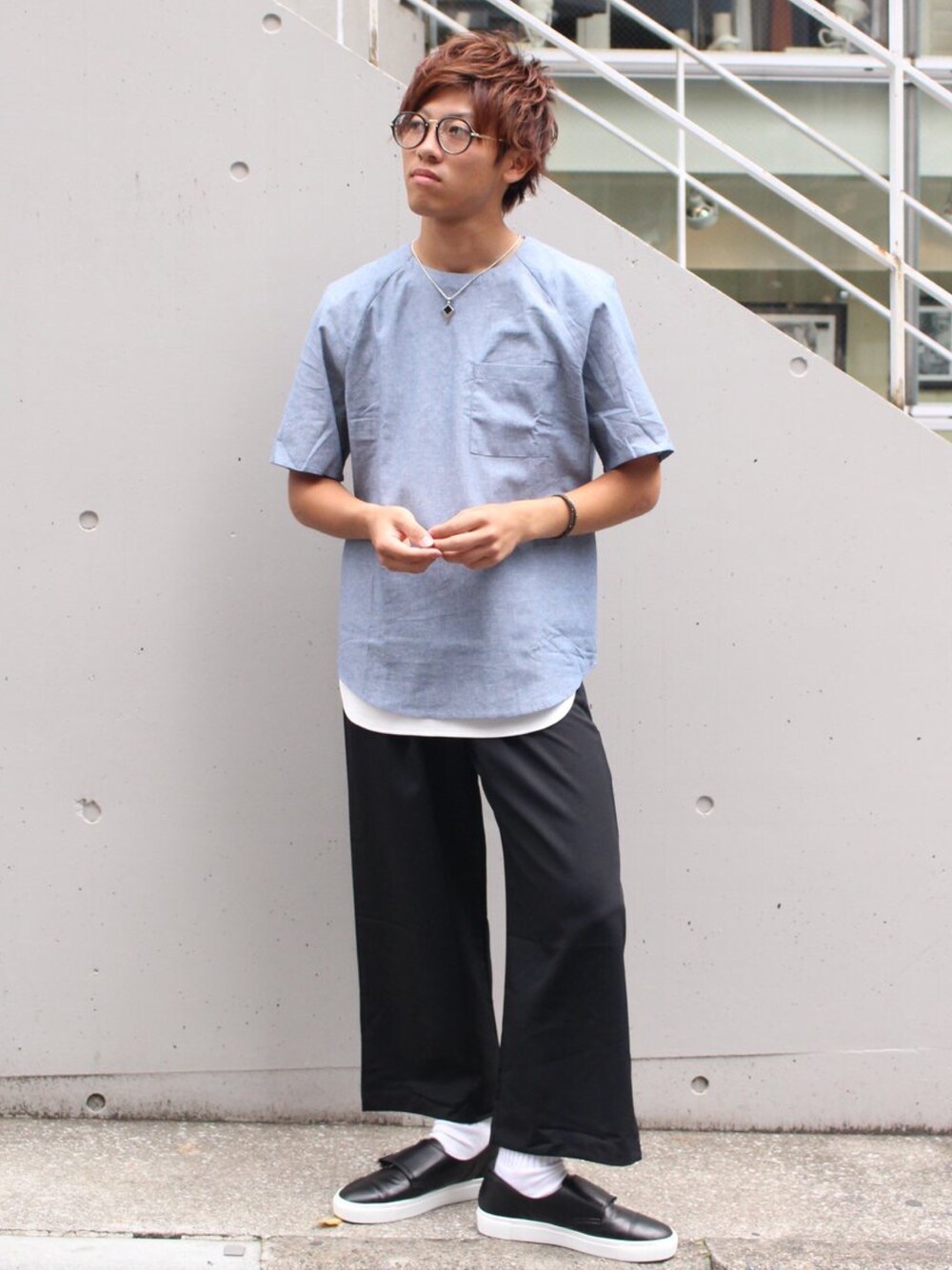 プルオーバーシャンブレー半袖シャツをタンクトップとレイヤードさせて涼しげなスタイル。夏に向けて爽やかコーデを楽しみたいメンズに最適です🎶
