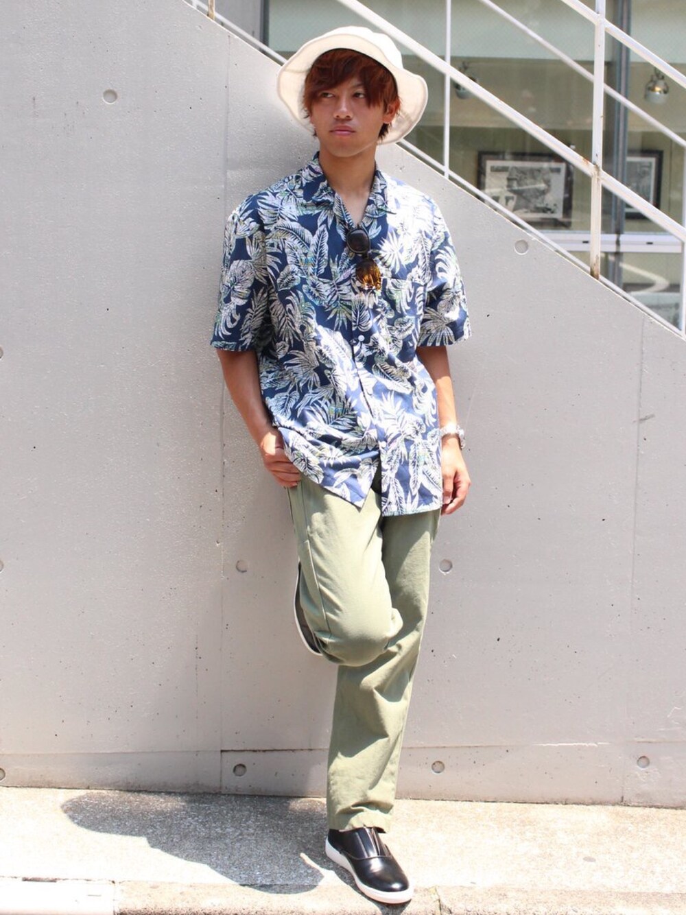夏にむけて、開衿タイプの総柄半袖シャツで今風な着こなしコーデをしてみよぅ🎶 シンプルカットソーに総柄シャツを羽織って爽やかスタイルが◎ モデル:Cuirs 専属モデル 清水雅也