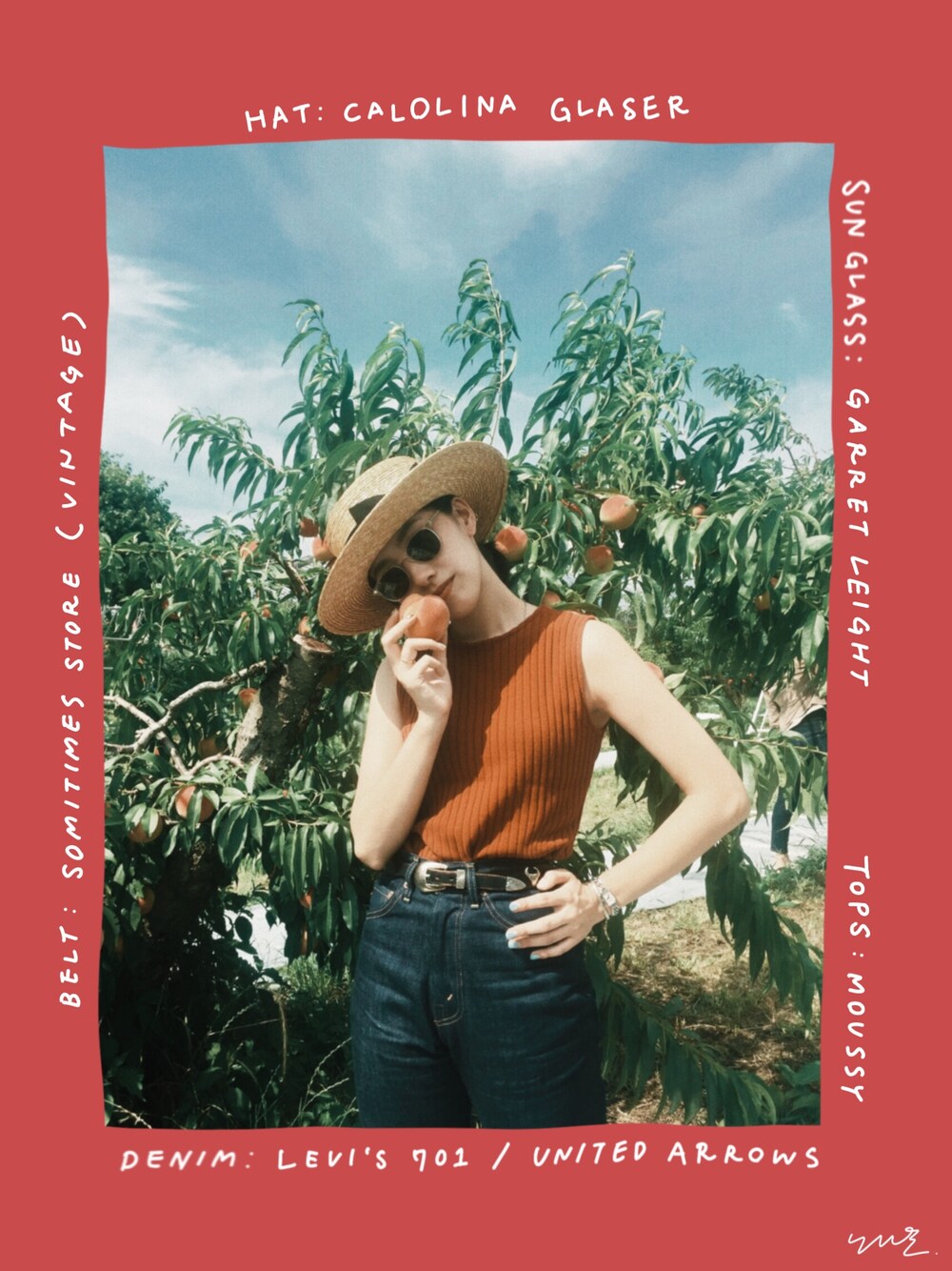 灼熱の桃狩りコーデ🍑 どうしても桃と青空バックに写真を撮りたかったので、それに合うようなスタイリングをしてきました。どうかな? 大きめのカンカン帽は本当に買って良かった!昔MEGさんがやっていたブランドのものです。今もあるのかな? 2色買いしたニットタンクトップはmoussy!フランス人みたいに着たら可愛いだろうな〜と思い、今までの私には無いチョイスのお買い物でした。結果正解! ただのキレイ目ロハスお姉さんにはなりたくないので、ビンテージの可愛いベルトを合わせてます。動物のコンチョがついてるよ〜〜 ▼背景について ibis paintというアプリを使用して文字を書いたりしています。詳しい描き方についてはこちら http://lineblog.me/culumi_nakada/archives/183883.html ▲▲▲▲▲▲▲▲▲▲▲▲▲▲▲▲▲▲▲▲▲▲