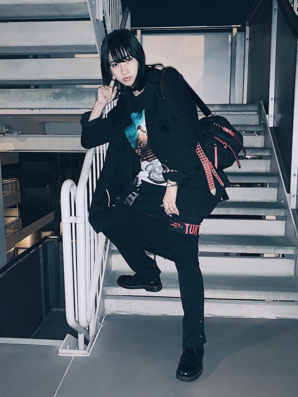 久しぶりのブリブリにゴツいコーデ\(^_^)/赤と黒! バンTをつなぎ合わせて作られてるワンピースはMIHARA YASUHIROのもので、1点1点違うデザインで販売されてるよ! ずっと持ってるPAMEOのジャケットは、袖をちょっとまくって着ると可愛いよ!