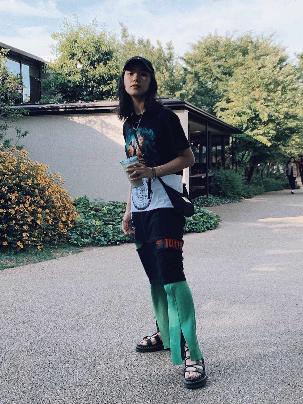 コーディネートの差し色になる緑色のパンツ(⌒‿⌒)!合わせやすくて履きやすくて楽チンで最高だなぁ 編み上げのサンダルと合わせてスリットから紐が見えるようにしたよ。