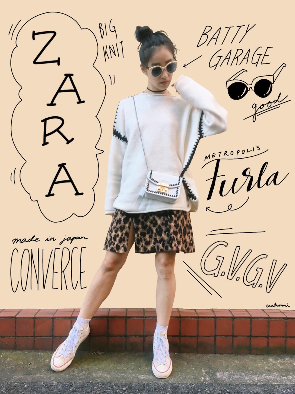 ミニスカートの日、ということで レオパード柄のG.V.G.V.のスカートをちらっと見せた、ビックシルエットのニットが主役のスタイリングです。 ZARAのニットはデザインも可愛くて着心地も良くて100点満点ですね。 ボトムに入れないで、だるっと着るのが今の気分です。 カバンのデザインがニットのデザインと少し似てて、合わせたら思いの外可愛かった!ラッキー! 白のコンバースを合わせて、白でレオパードをはさみました。インパクトのあるボトムは他の色を統一させて派手すぎないようにします。 ▼手書き文字について ibis paintというアプリを使用しています。詳しい描き方についてはこちら http://lineblog.me/culumi_nakada/archives/183883.html ▲▲▲▲▲▲▲▲▲▲▲▲▲▲▲▲▲▲▲▲▲