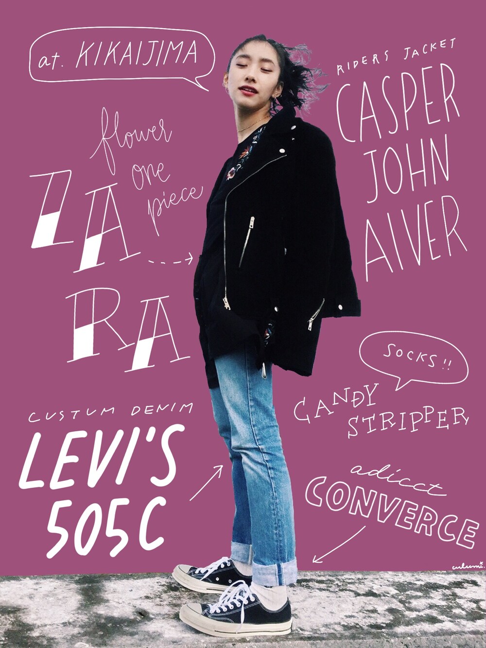 風になびかれてます(笑) 本当はワンピースにライダースだけで過ごす予定だったのですが、あまりにも寒すぎてデニム履きました。コンバースとのバランスを取るために裾をちょっと折っているのがポイントです。 オーバーサイズのライダース、この写真だと分かりやすいかな…? ZARAのワンピースは、着ているだけでそれZARAの?って言われちゃいますが(笑)可愛いのでそれで良しです。 ▼背景について ibis paintというアプリを使用して文字を書いたりしています。詳しい描き方についてはこちら http://lineblog.me/culumi_nakada/archives/183883.html ▲▲▲▲▲▲▲▲▲▲▲▲▲▲▲