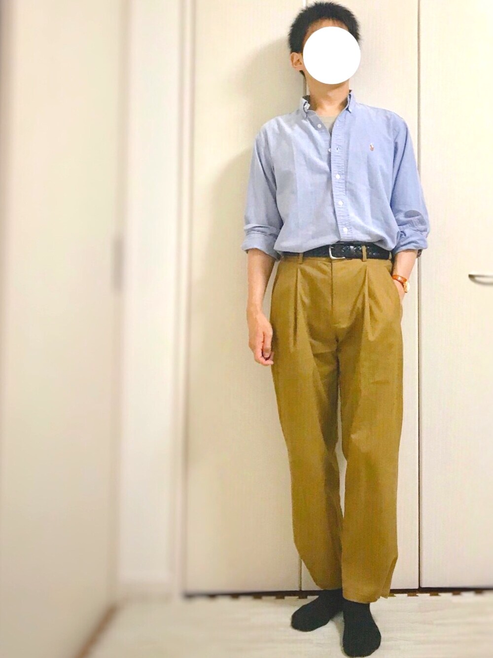 シャツ:ラルフローレン 古着 2900円 パンツ:wild life tailor オリジナル 16000円 タックが深めに入ったチノはクラシカルな雰囲気が出て渋いですね。