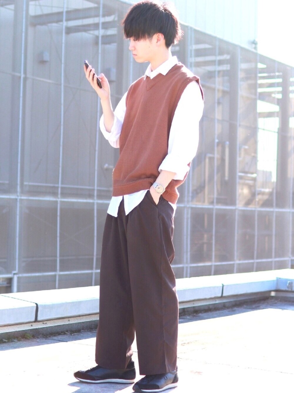 ブラウンベースで🍊 綺麗めなニットベストをワイドパンツではずしてます☑️ ワイドパンツはtaiのオリジナルアイテムでコスパもシルエットも最高です😆 best Free shirt L pants M
