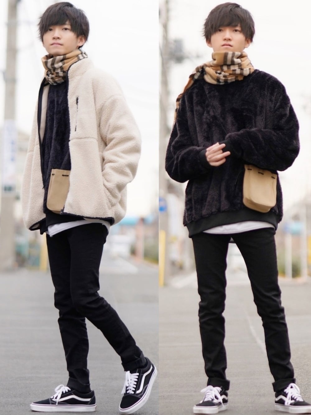 GU×kutir black プチプラ! 今日はブルゾンもスウェットもモコモコなプチプラコーデ🤤✨ モノトーンとベージュのマフラーとバックで三色でまとめてます🙆🏻♂️ このkutir blackのスウェットのもこもこ具合がたまらない!🥺