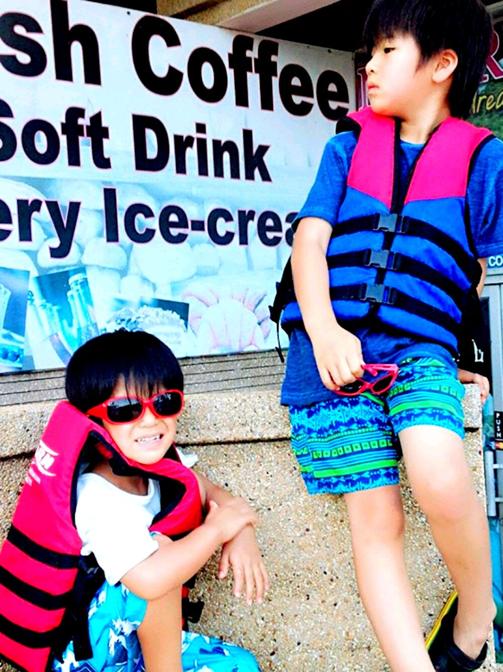海コーデ♪ 眠そうなお兄ちゃんと、ハイテンションの弟。。 シュノーケリング楽しみました✨ 水着 GAP Tシャツ ZARA サングラス ローカルなお店で購入(笑)