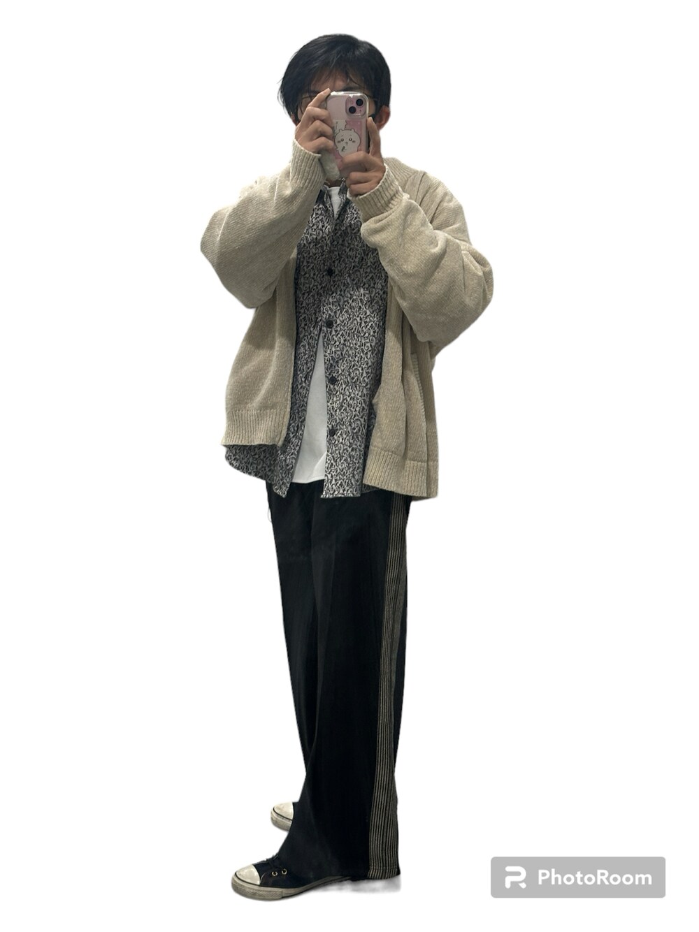 ドライバーズニット 柄シャツ カットソー トラックパンツ スニーカー 反省点いろいろありますが、革靴にするとかね。こんなもんかな? 頑張ります。