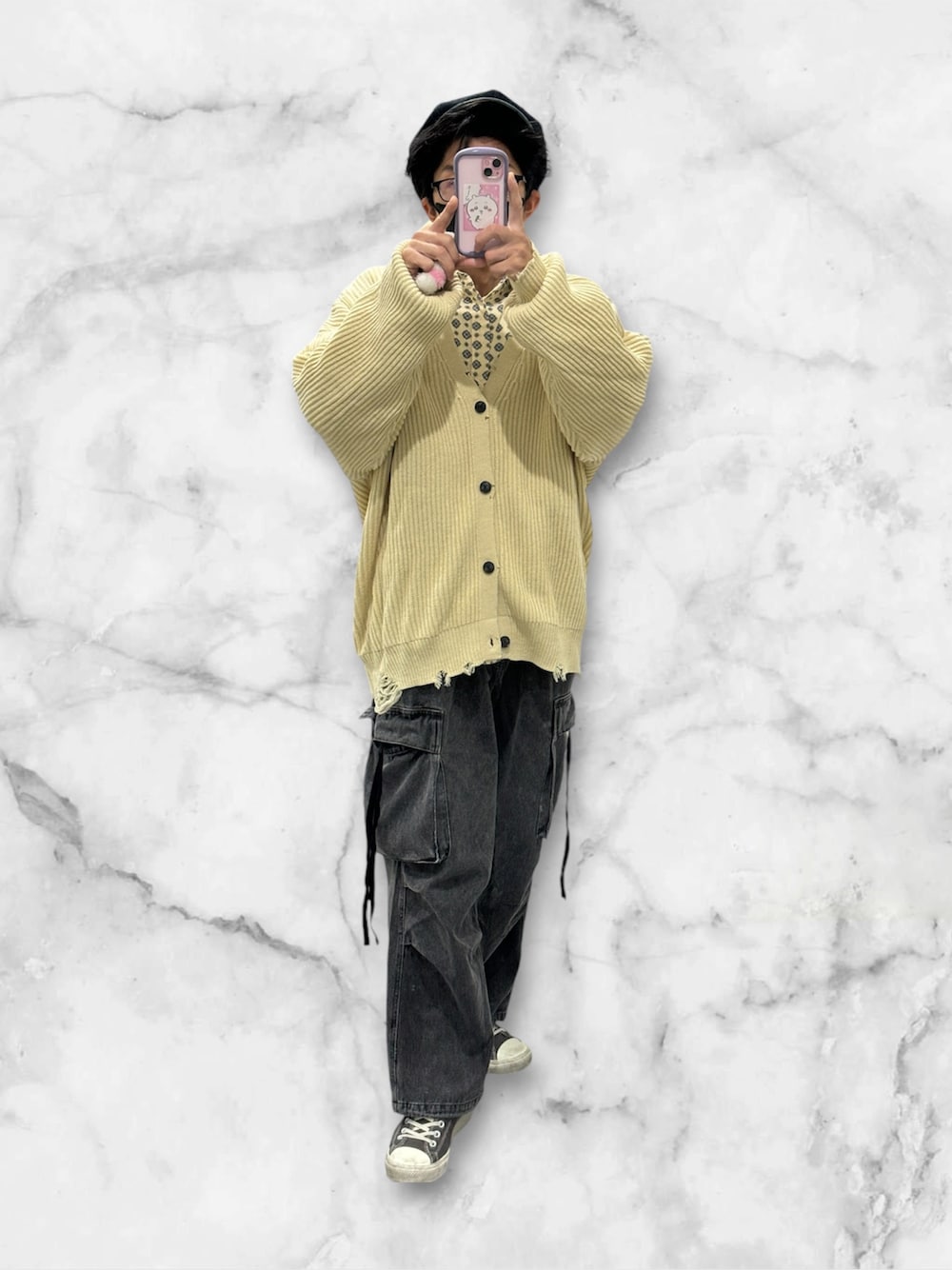 タウンクラフトとナンバーナインの別注シャツ と色味があう、カーディガンを合わせて ダメージ加工がグランジ感あります。 髪型がグランジ感ないので、デニムキャスケットで隠してます。