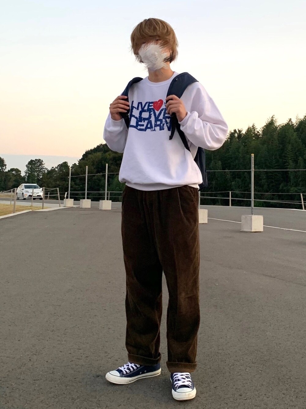 おはようございます🌶 いいね、お気に入り返します!! 本日はスウェットにコーデュロイパンツでThe古着なコーデ組んでみました! 深めのブラウンに白はやっぱり合いますよね 💪 ネイビーのプリントってことで足元にもネイビーを入れてちょうどよくバランス取ってます いいね、フォローお願いします!