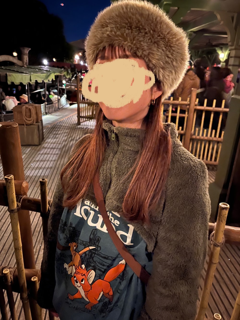WDWで買ったカントリーベアのサミーの帽子を被ってランドに行きました。 sheinで700円くらいで買ったクロップドフリース?があたたかくて合わせやすくお気に入りです。