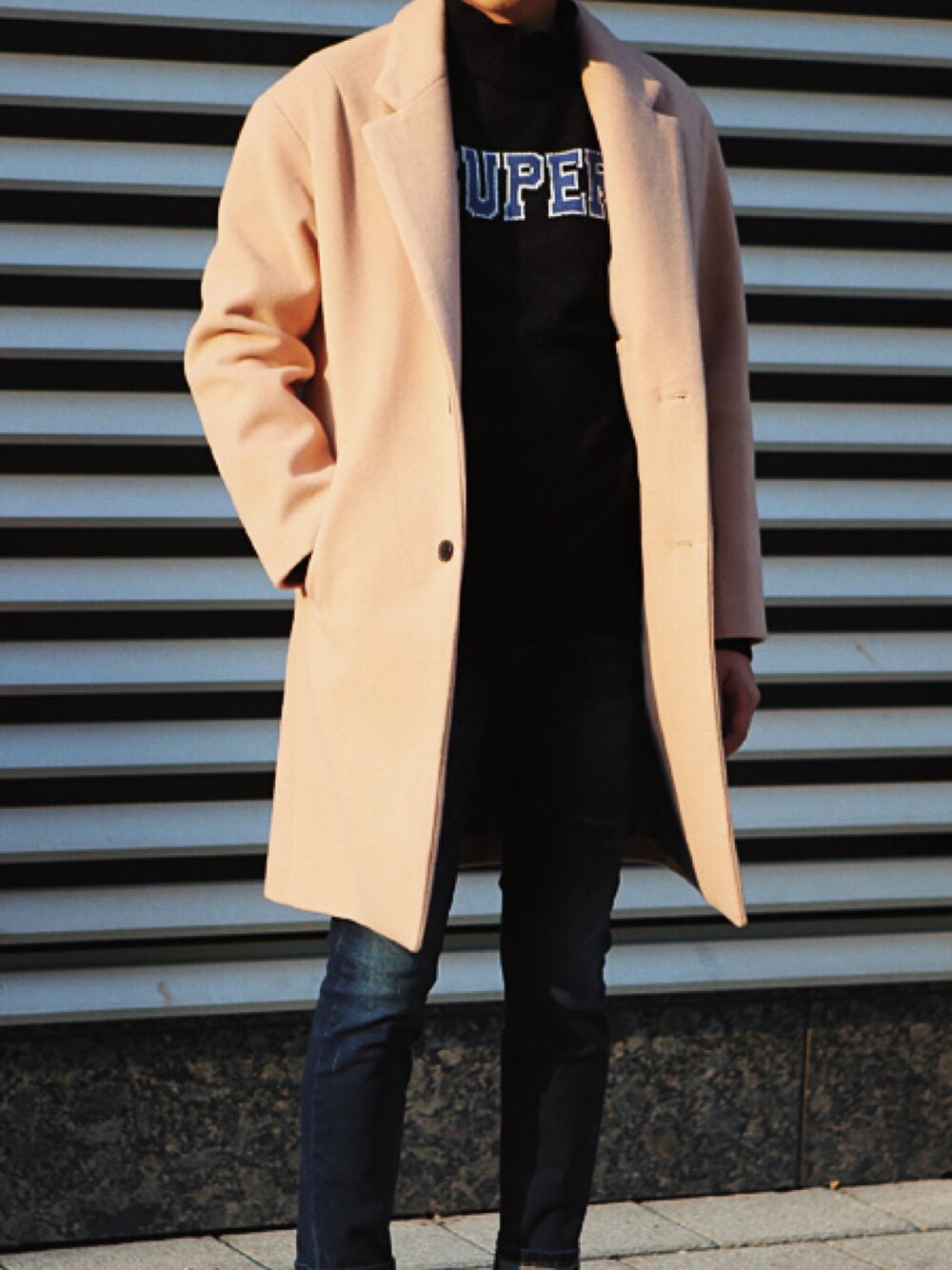 ベージュ系のチェスターコートを着用したメンズの秋コーディネートの1枚目の写真