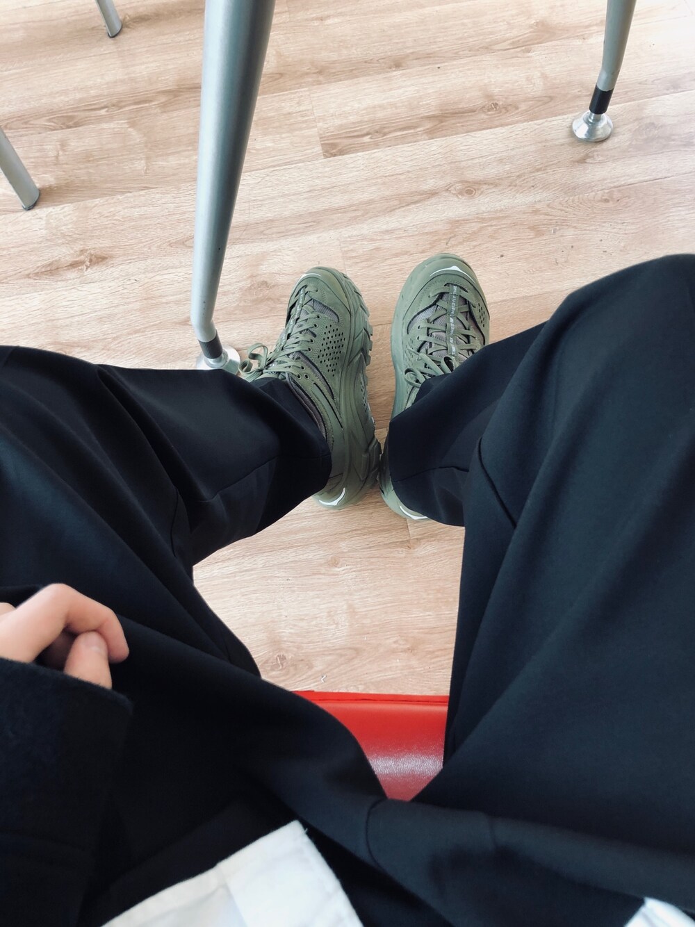 グリーン系のスニーカーを着用したメンズの春コーディネートの1枚目の写真