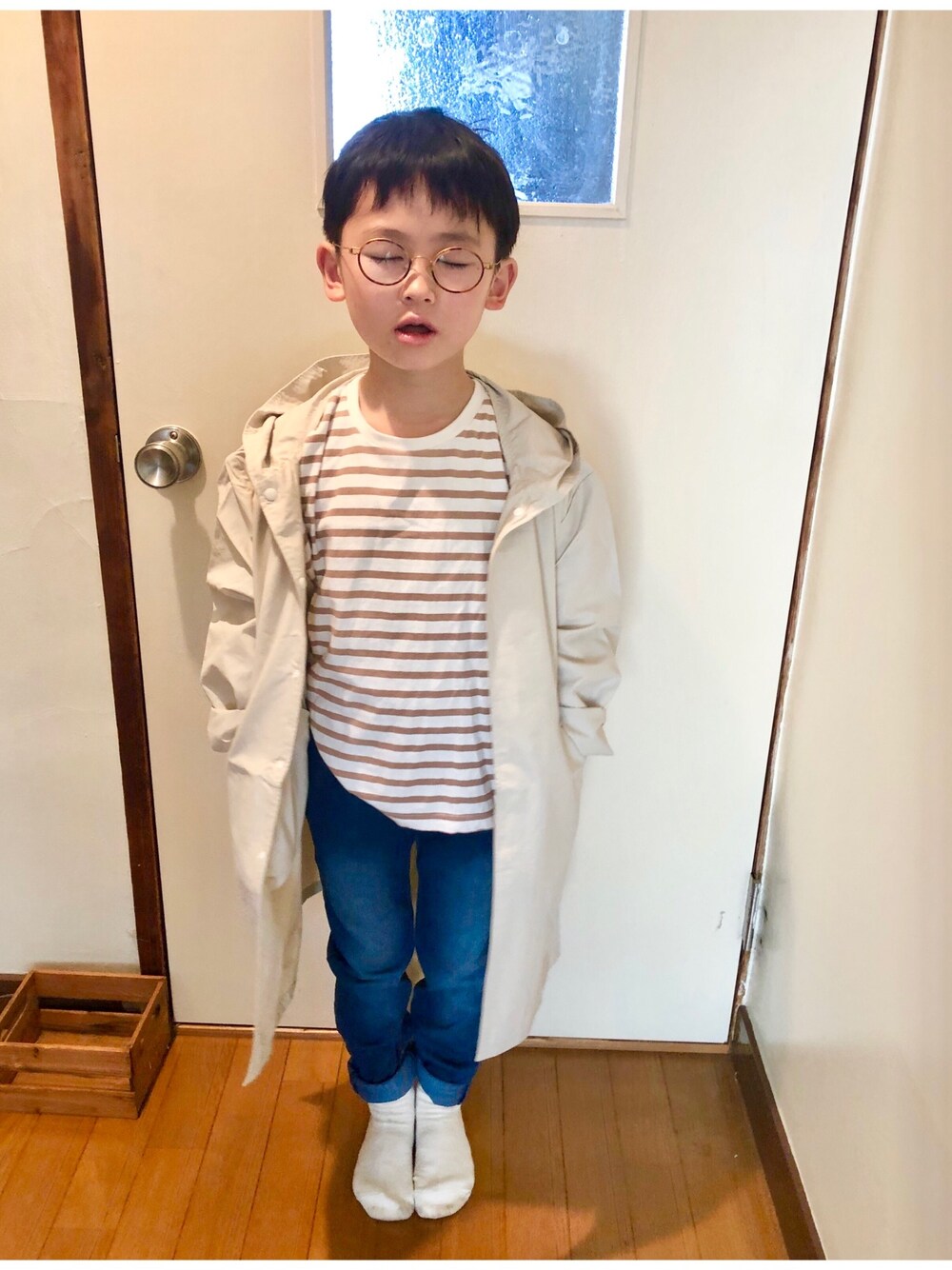 見て下さってる皆さま、ありがとうございます(^^) お気に入りや♡、とっても嬉しいです♪ フォローして下さった方も重ねて感謝いたします😂 先日ZOZOで春物探し中、ラスト1点で見つけて慌てて購入したアウターです⭐︎ 普段何日もかけて迷いまくって購入に至るのですが、一目惚れしてサクサク購入したのは久しぶりです笑 まだ学校に着せていく勇気はないので、今日は撮影だけ📸 まずはスタンダードにボーダーとデニムを合わせました✨ スキニーはジャストサイズを買いたかったけど、前回あっという間にサイズアウトしてしまったので、ビビって140サイズです💦 スキニー感は薄いけど可愛いのでまぁ、いっか😂
