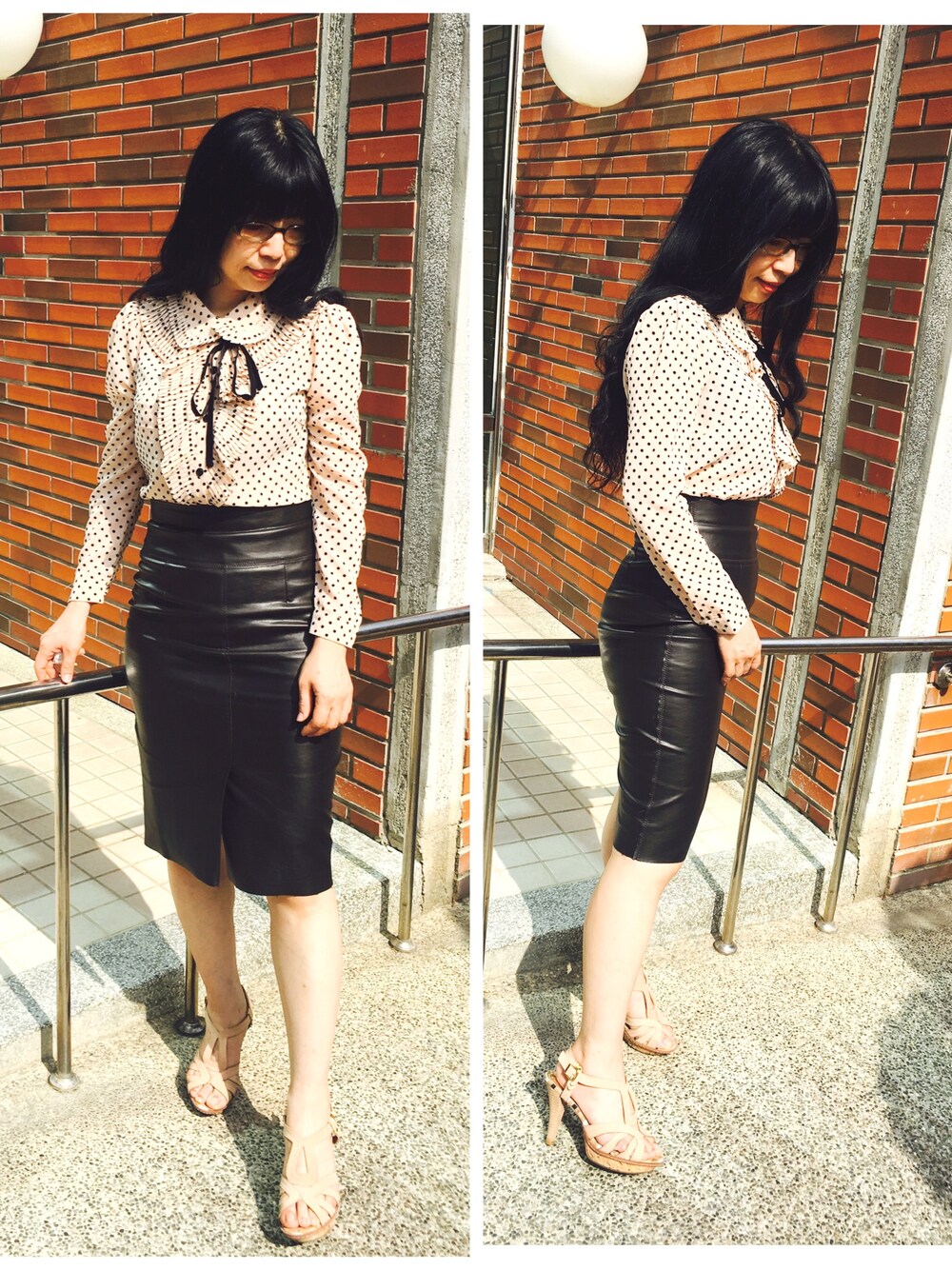 復古襯衫配上皮裙衝突的時尚感