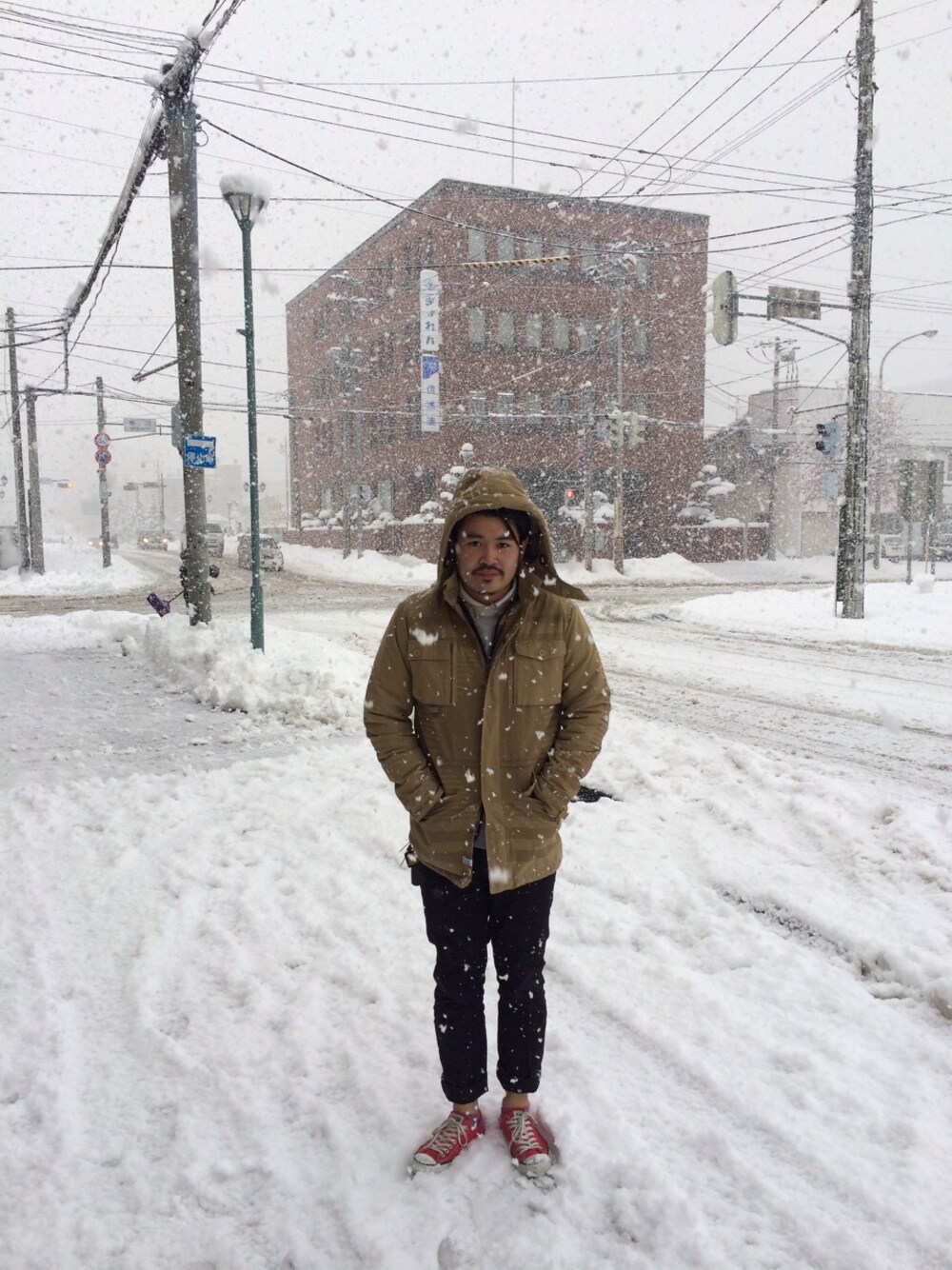 スニーカーで来た。