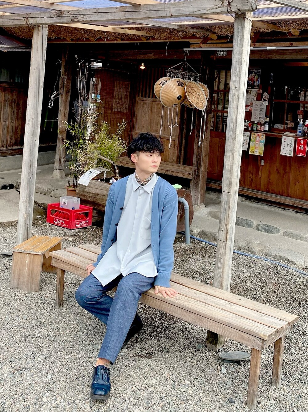 GW用お出かけスタイリング🎏 前回あげたスタイリングのジャケット無しバージョン。 ジャケを脱ぐだけで ブルー×白統一で爽やかな印象に。