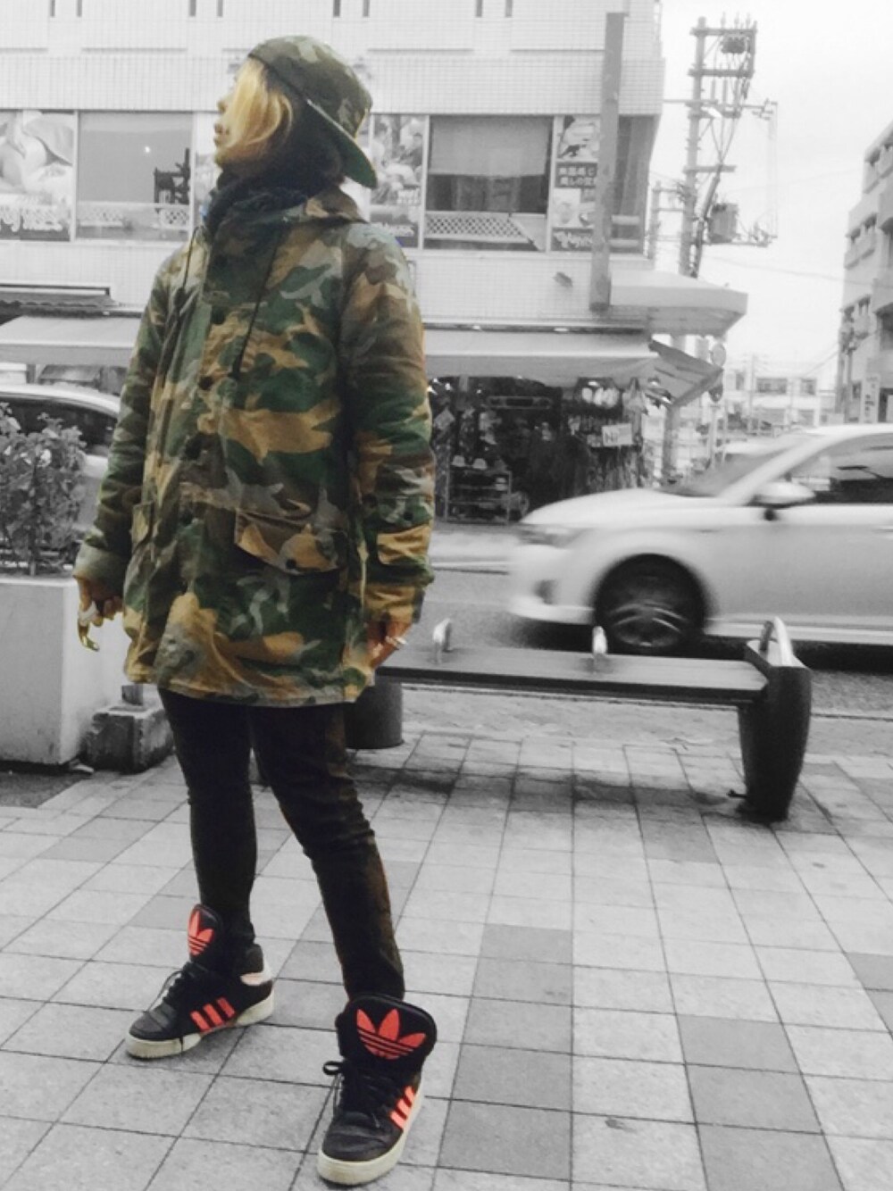 キャップ、ジャケット、スキニー オール迷彩コーデ! 街中だと逆に目立つ← 個人的に1番のメインというか 見せ所はキャップのツバの ヘビ柄! チャラポップ!!(造語)