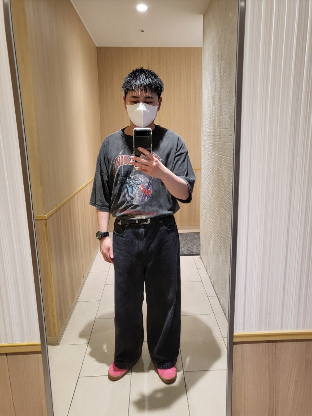 バンT風のTシャツとワイドブラックデニムを組み合わせたシンプルブラックコーデ🖤⛓️ あえて靴は黒に統一してないのがポイント🎶 このVANSお気に入りすぎでやばい🤦♂️笑