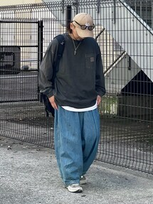 DAIGOのTシャツ/カットソー「《JaVaジャバ コラボ》古着〝っぽい〟がちょうどいい。綿100%ピグメント加工ポケット付き オーバーサイズ ユニセックスロングTシャツ」を使ったコーディネート