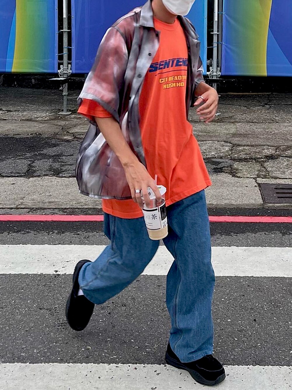 ブルー系のデニムパンツを着用したメンズの秋コーディネートの1枚目の写真
