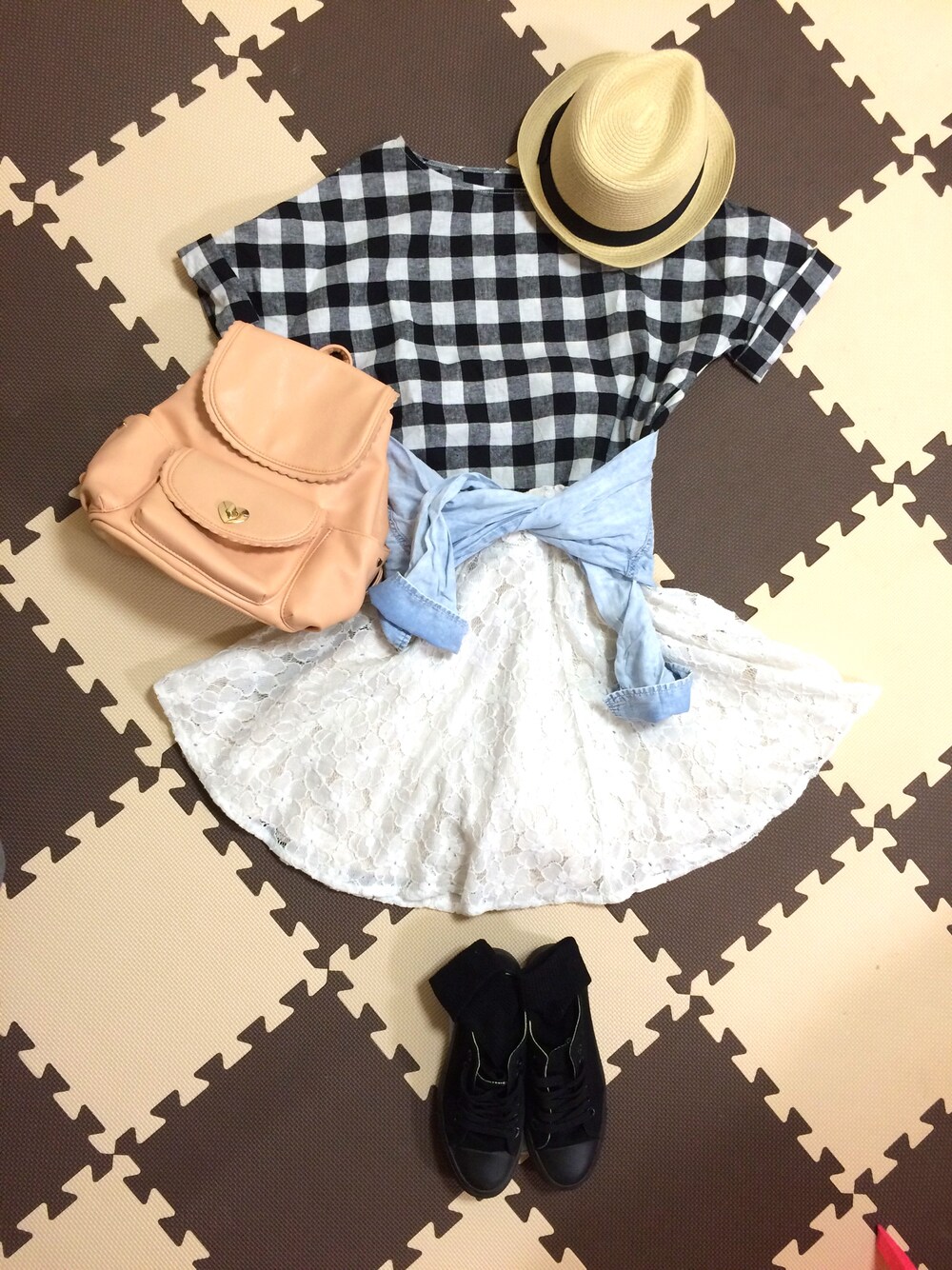 こんばんは(*^^*) 昨日のギンガムチェックのトップスと 麦わら帽子を着回したコーデです♪* スカートは写真だと見えづらいですが レーススカートです★彡 靴下は写真では三つ折りですが くしゅくしゅっとして履きます^ ^ いいね、フォロー ありがとうございます♡