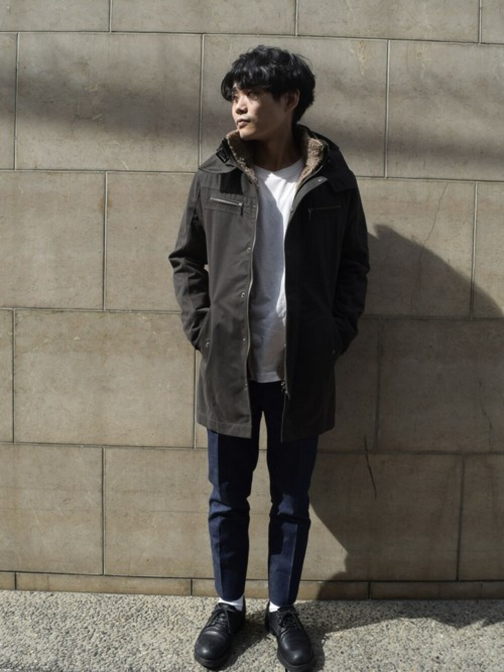 【モッズコート】 モッズコート、というと 「ミリタリー感があって、腕周りも大き目で、フードがついてて、大きくて長い。」 みたいな感じをイメージするよね。 でも、僕はどっちかというとキレイ目なコーディネートが多いから こんな感じのミリタリーモッズが欲しかったんだ。 インナーボアも外せるし、表面の生地感もパッリとしててイイね。 デニムに、白シャツの定番スタイルが多い僕には、ぴったりのコートだね。
