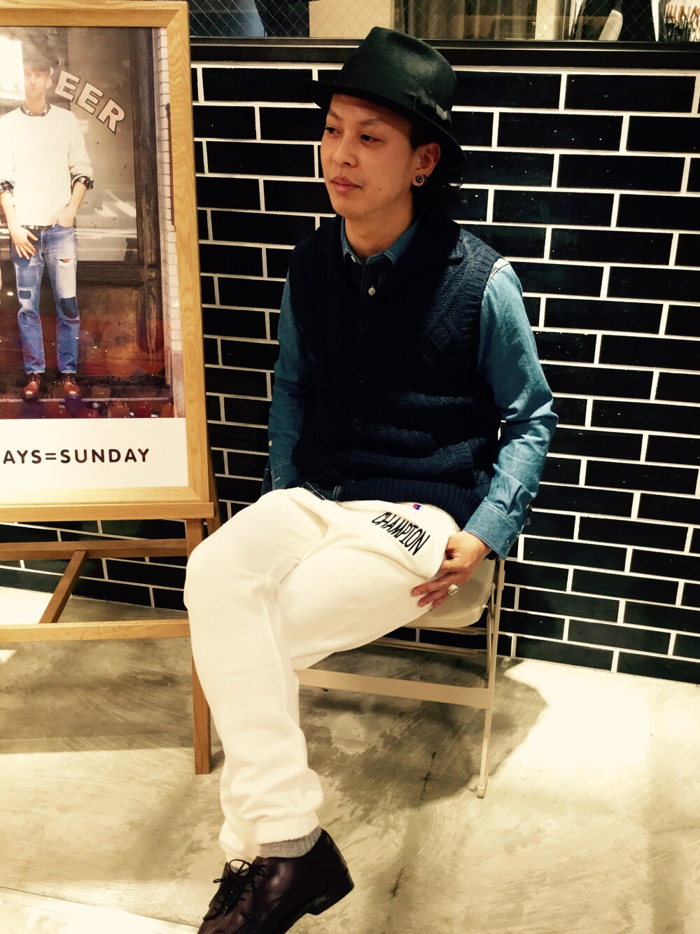 チャンピオンのパンツで外して全体的にきれい目にまとめてます。 小物使いがポイント。