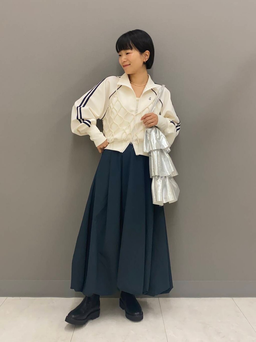 しだみのトートバッグ「フリルメタリックトート」を使ったコーディネート