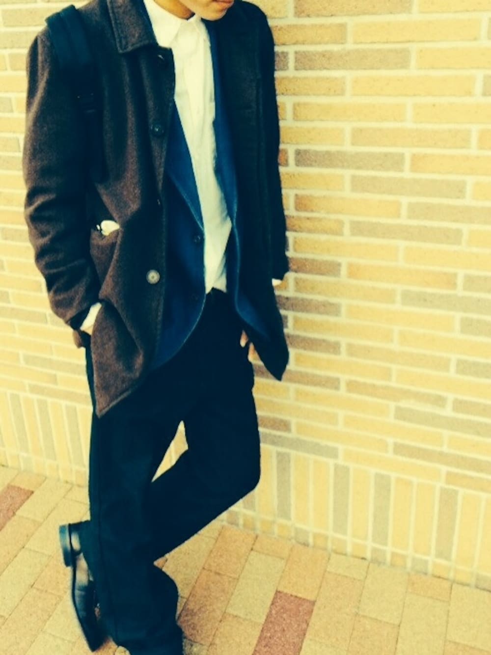 コート:古着 シャツ:UNIQLO パンツ:古着 白ソックスとローファー 私服高校。今日の制服
