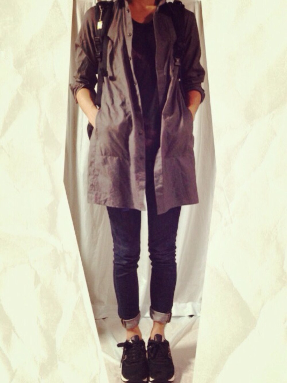 ふたたびお部屋撮りです。 シャツを羽織っても肌寒さすらある今夜の大阪。良い季節や。 ニューバランス履くのはいつぶりかというほど久しぶりです。1400はタンが分厚くて優しいですな。 ロングシャツは、前を開けて薄手のコートっぽい雰囲気が出すのが好きです。 汗かきにはグレーは天敵ですが、秋になれば頼もしい味方です。