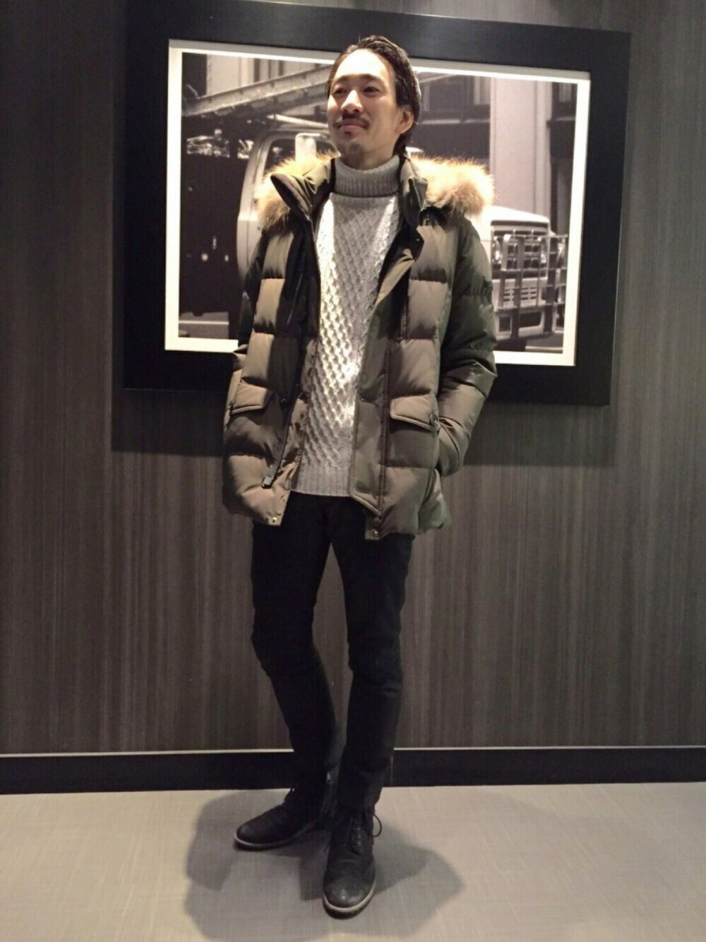 カーキのダウンコートを使用した大人カジュアルコーディネートです。 スポーティになりすぎないように、インナーにはタートルネックのセーター、下半身はブラックで統一させ、洗練された大人な印象に仕上げています!