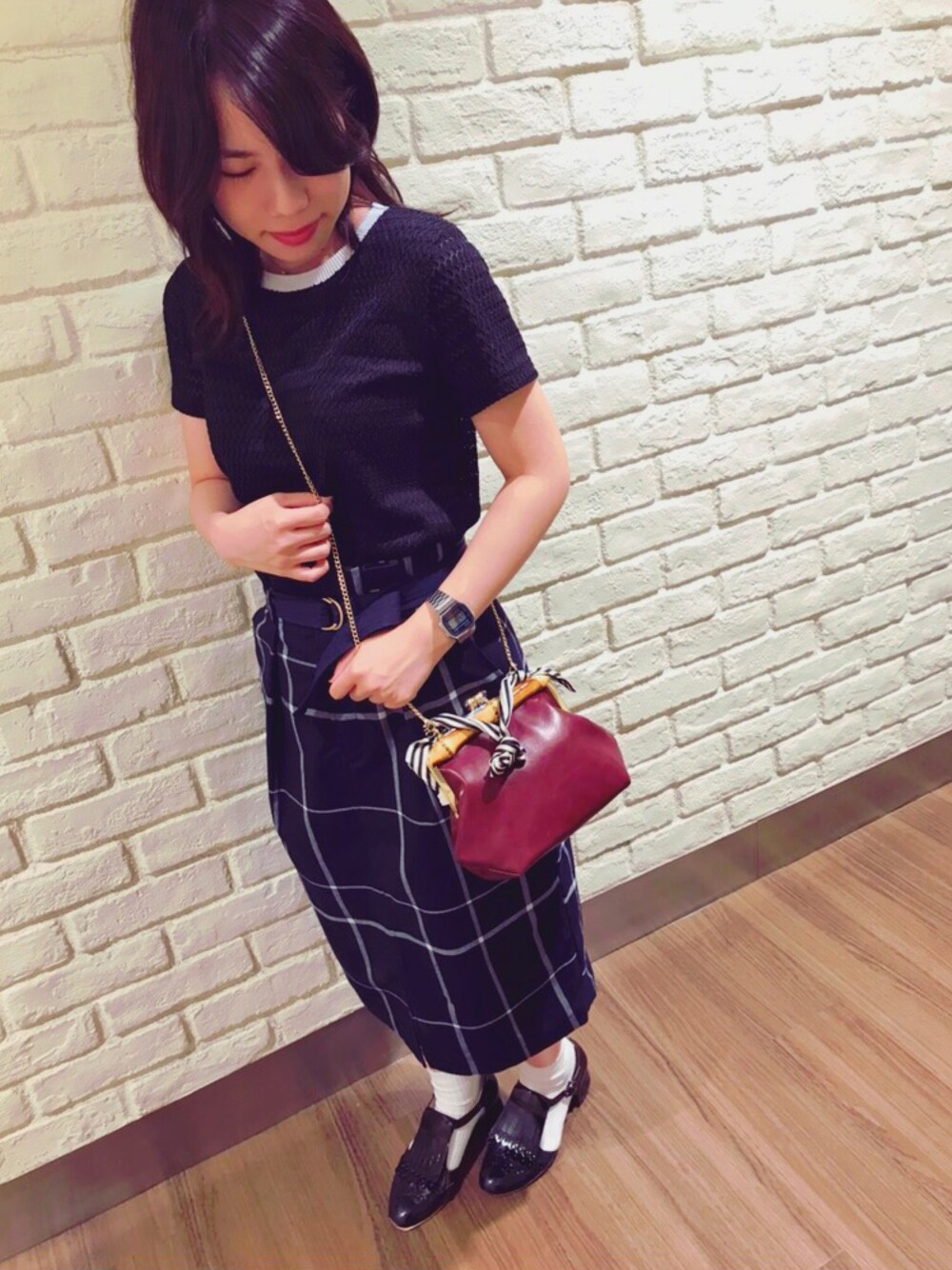 ACCOMMODEの秋物新作バッグをコーディネートのポイントで取り入れました♪ 全身がベーシックな色なので、ボルドーカラーで華やかに🍷カバンには付属のチェーンの他に、スカーフも付いているので2wayで使えます👀 黒のエナメルのドレスシューズには白い靴下を合わせて、引き締め効果を!