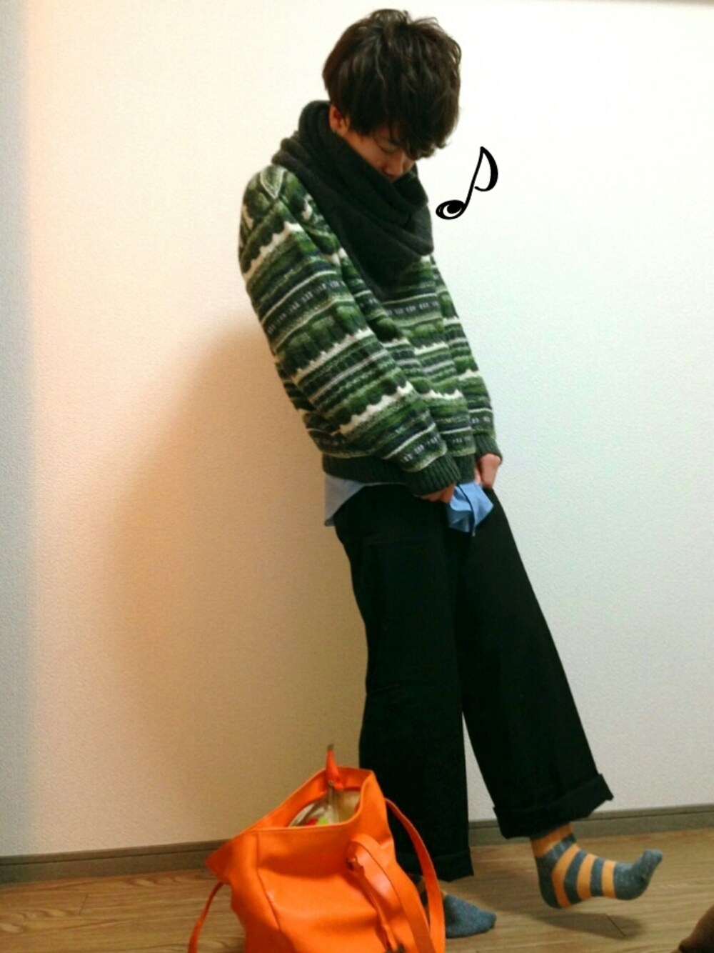たちつてトヨタのお約束。 初投稿です。 雪降ってます。ニット生地に雪がくっついて溶けて、、、(、ン、) お気に入りのセーターはイタリア生まれ。モフモフのぼわぼわのオーバーサイズがgood!!! 普段スキニーしか履かないけど、ワイドパンツに挑戦!難しい。でもハマってまうっ! スヌードはPaulSmith \20,000 セーターは古着 \1,900 ロングシャツも古着 \900 ワイドパンツはもらいもの。