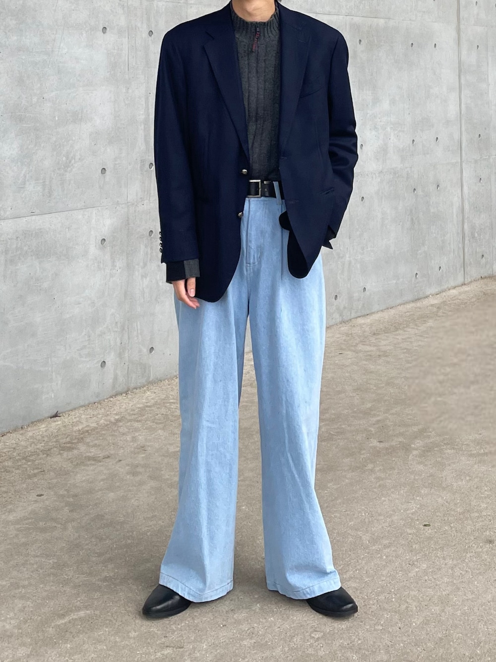 紺ブレ淡デニム ジャケットは銀ボタンなのがお気に入りです。 デニムははシルエットが綺麗なのでオススメです!パンツはシルエットで選ぶようになってきました。