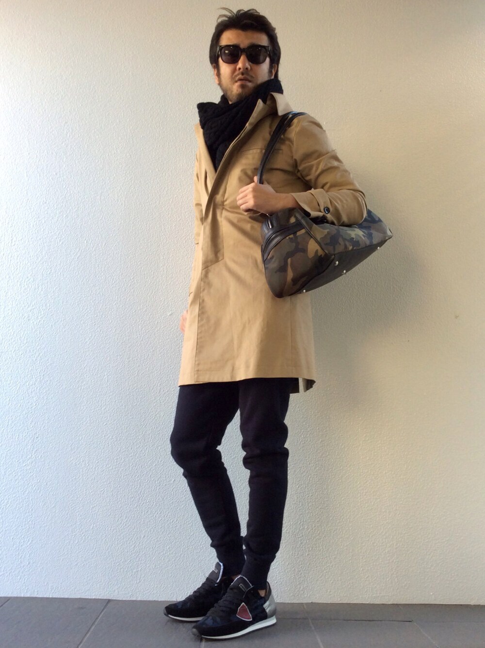 本日のコーディネート☆ キレイめなトレンチコートに靴とバックにカモフラを使い、 シンプルながらさりげなく柄モノを取り入れたスタイルにしてみました。