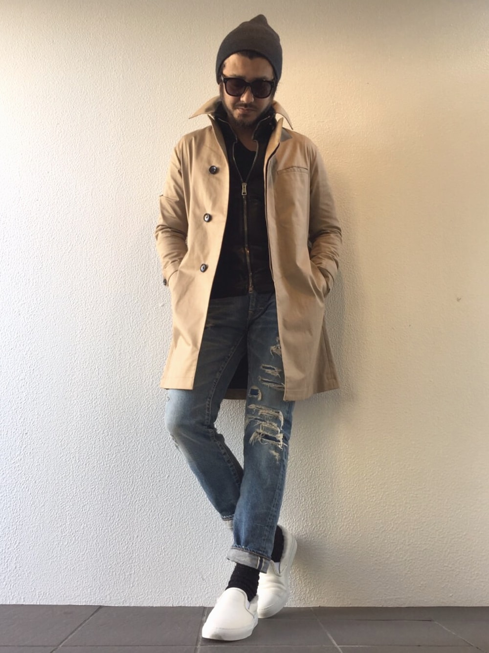 本日のコーディネート トレンチだけだと寒いのでインナーにレザーを☆ また、デニムとレザーのコーディネートにトレンチを合わせることによって 男らしさ+清潔感のあるスタイリングに仕上げてみました。