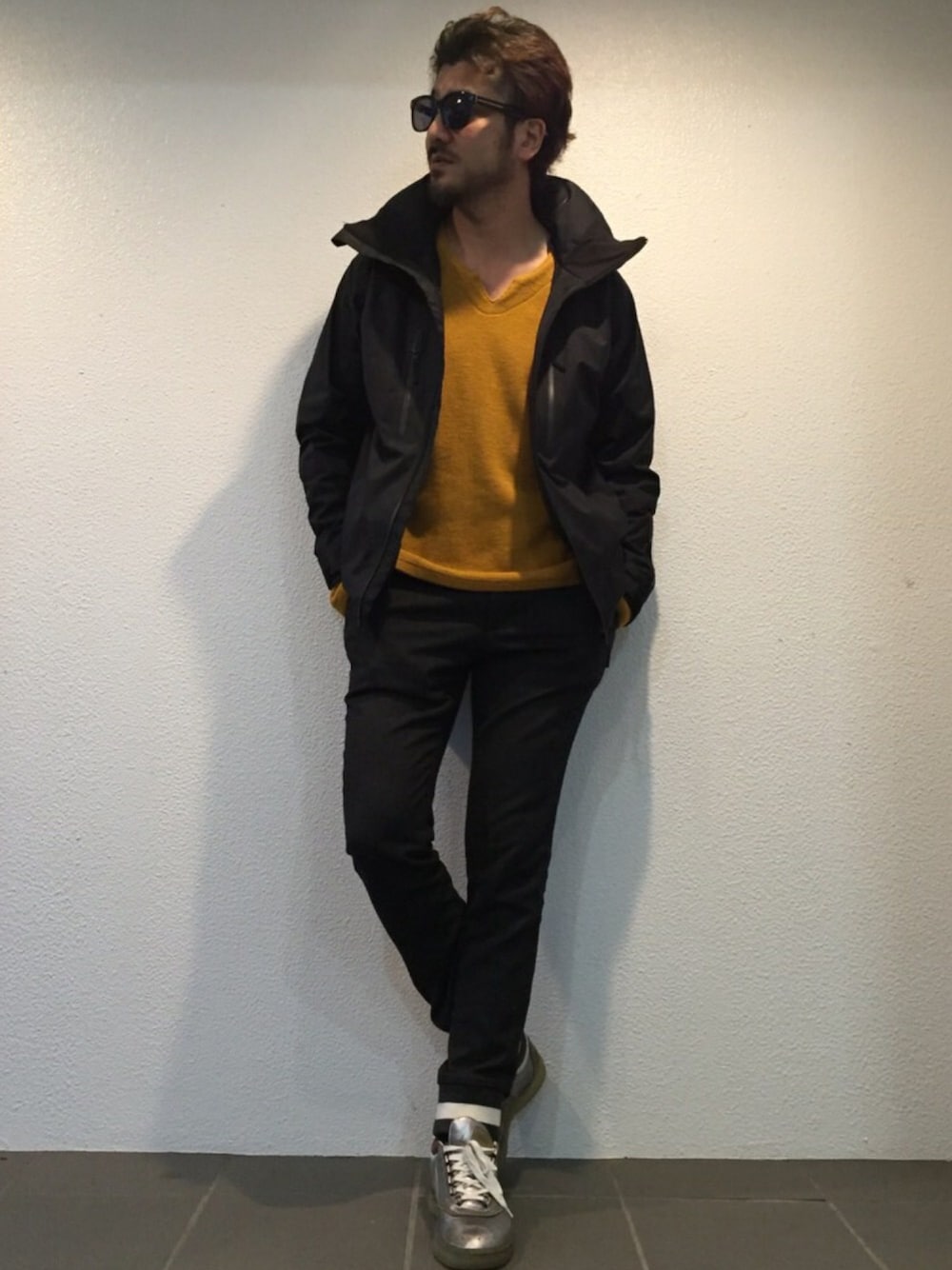 本日のコーディネート。 今日は暑いのでライトブルゾンを羽織ったコーデ☆ 全体的に色を暗めにし、差し色にマスタードイエローを使って インナーを主役に見える様にしてみました。