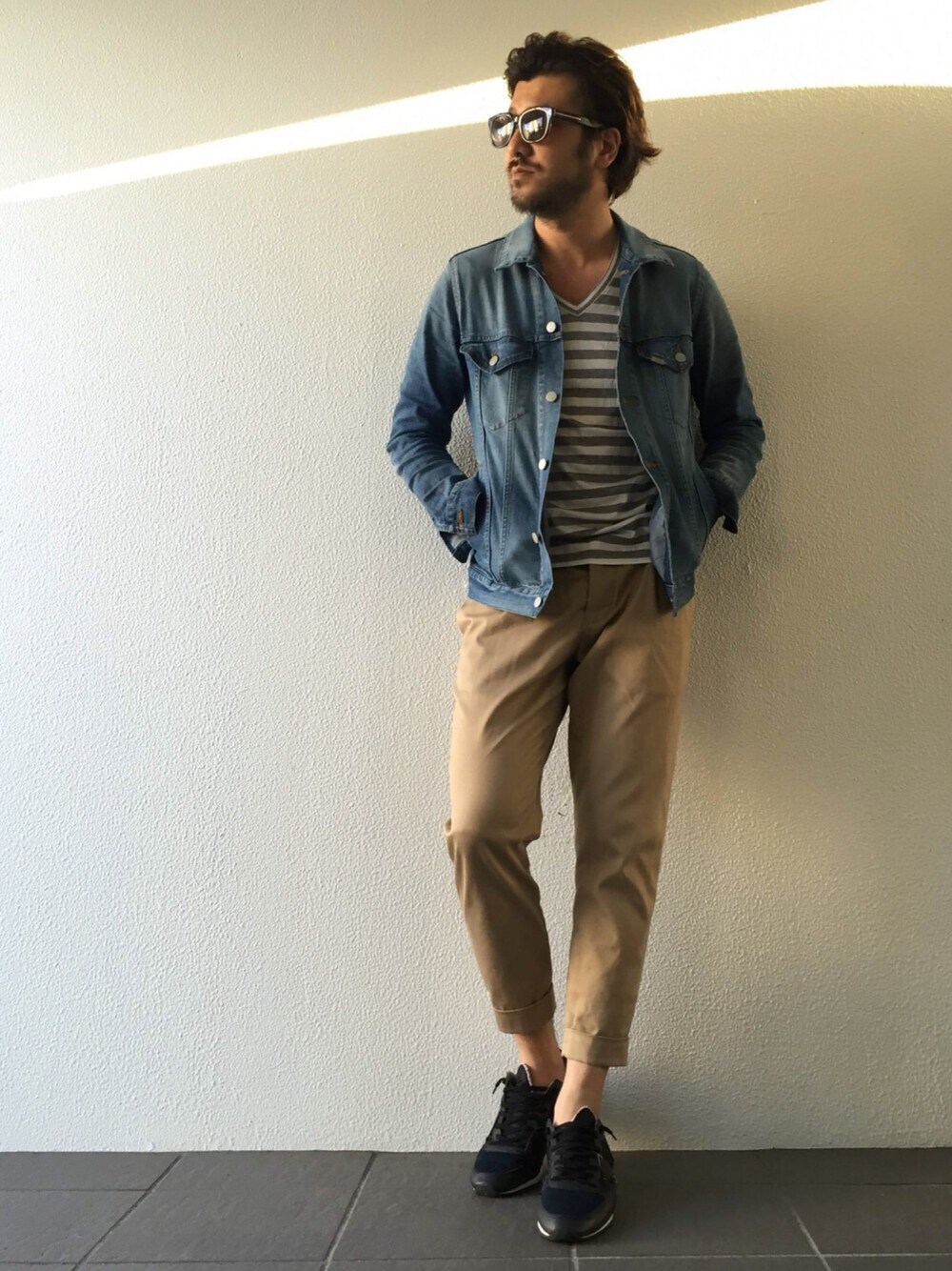 皆さん、こんにちは。 今日のコーディネートです! Gジャンにベージュのパンツに インナーにはボーダーのTシャツを合わせてみました♪ ボーダーTシャツで爽やかなスタイリングに☆ すっきり感のあるスニーカーを合わせ脚長効果を(^_-) では、皆様のコーディネートの参考になればと思います!