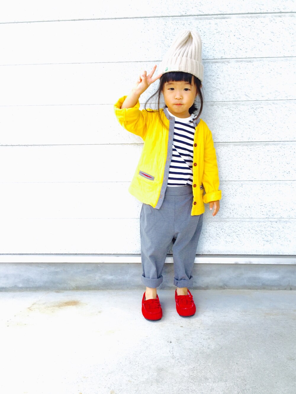 からし色祭りに参加です☆1辛です☆ さっそく昨日買ったばかりの テーパードパンツ✨ 嫌がると思いきや、本人 おっしゃれ〜💕とノリノリ笑 よかった、はいてくれなきゃ どうしようと心配でした笑 去年買ったカーディガンに合わせました サイズ95だけど、まだ袖が長い😂 いつも服買う時のサイズ悩みます😅 カーディガン→95 ボーダーT →100 テーパードパンツ→Mサイズ(100〜110)