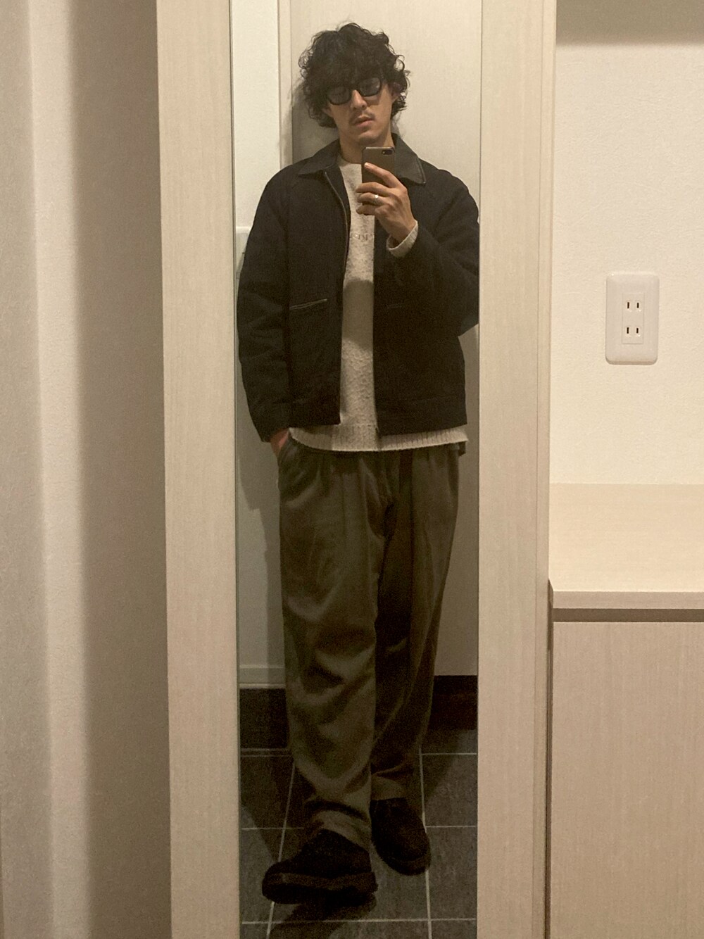 supremeのワークジャケットを主役にコーディネートを組みました。 ニットの色味はベージュ、ボトムスの色味はカーキにして、アースカラーで秋らしさを出しました。 男らしく見えるジャケットがハードな印象になり過ぎないように配色を考えました。 足元はスウェードのジョージコックスで大人っぽく、上品になるようにまとめています。