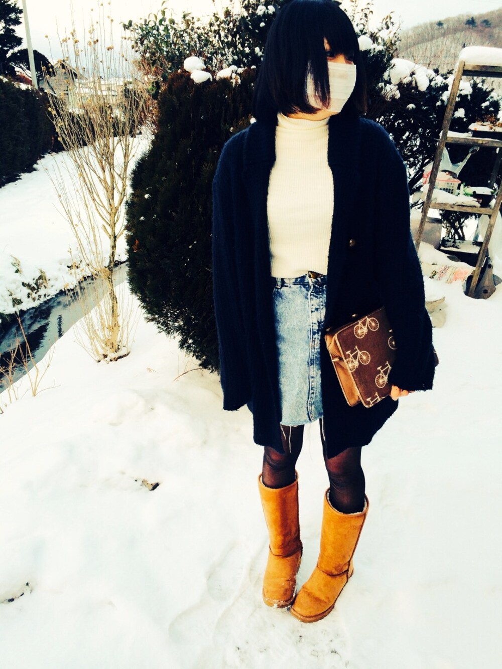白ハイネック GU ケミカルスカート 古着 ブーツ お姉ちゃんの勝手に拝借 ニットコート E hyphen ちょっとすき家までー(笑)。 岩手の冬は厳しい。