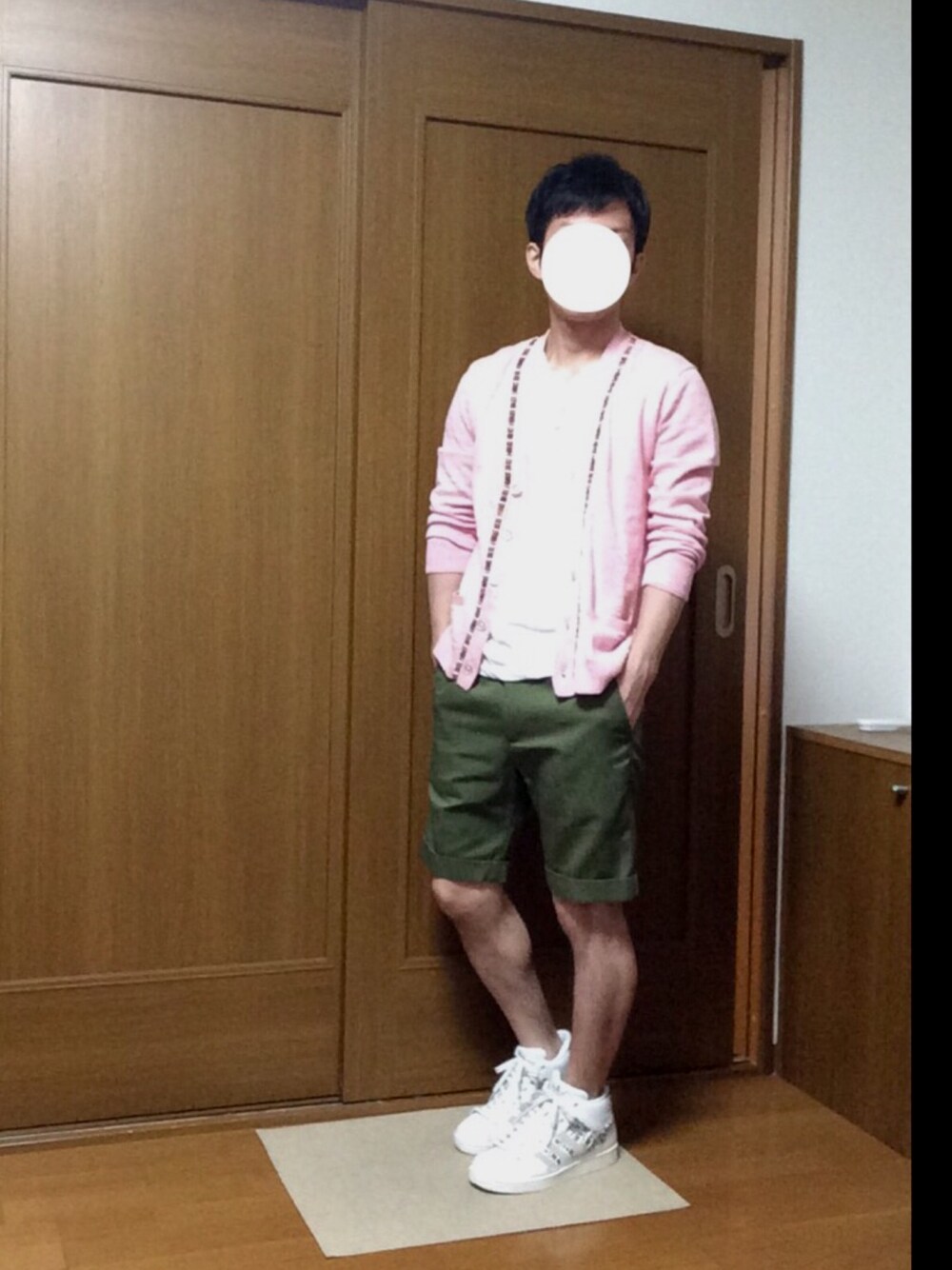 ●today's coordinate● ・夏向けリネンカーディガン(ピンク) ・サングラスプリントT(ホワイト) ・ショートチノパンツ(カーキ) ・adidasハイカットスニーカー(ホワイト) 基本的に3カラーでまとめたコーディネート🙂 みなさんお休み✨enjoyしてくださいねー👏🏻👏🏻👏🏻😄