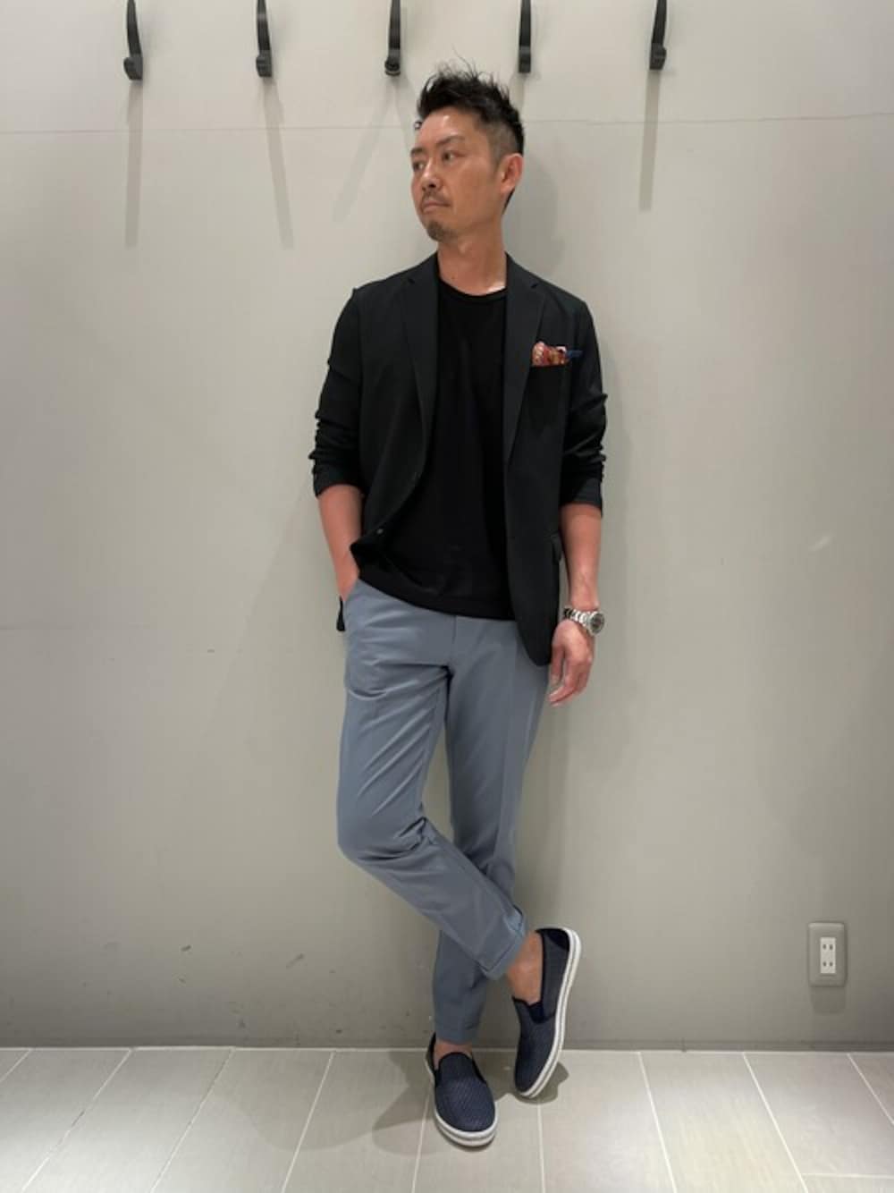 ブラック×サックス ジャケットコーディネート。 ジャケットは3Dメッシュ仕様の通気性の高いモデルで、伸縮性抜群です。自宅でのお洗濯も◎ オフィスカジュアルから普段着まで、幅広く着回し出来ます。