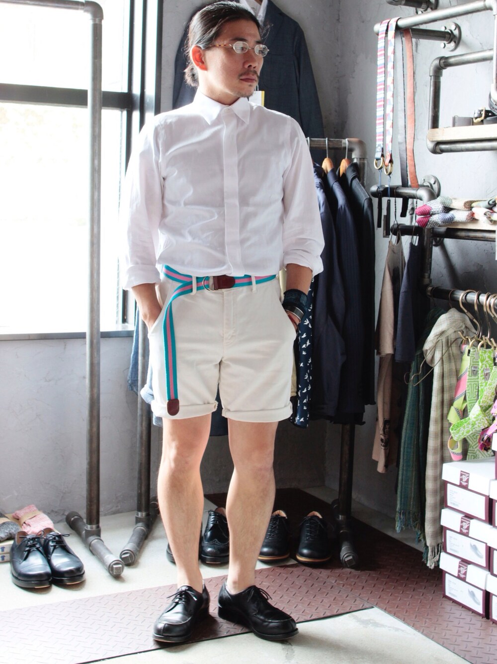トップス/ beatiful people パンツ/ USED シューズ/ HEINRICH DINKELACKER 眼鏡/ obj アクセサリー/ YASUHIDE ONO,PAT PRUITT,CAPUTO