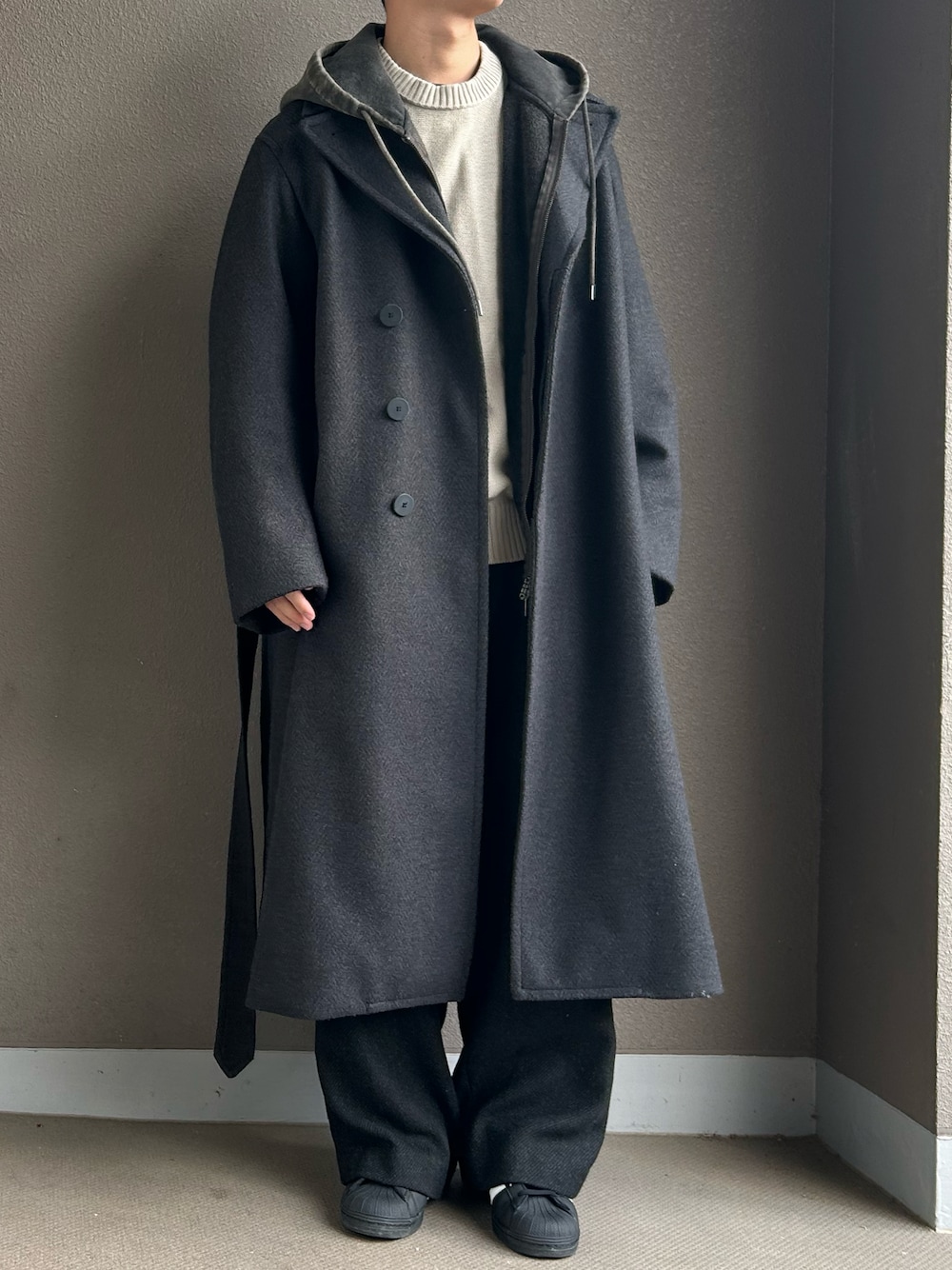 dai31のチェスターコート「SMOOTH HERRINGBONE MAXI OVER COAT」を使ったコーディネート