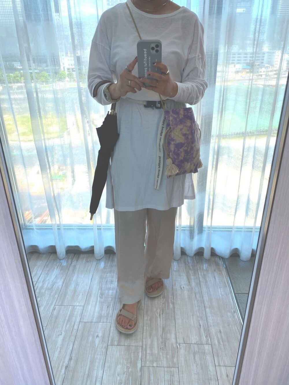 リネン素材の光沢あるパンツがお気に入り ワントーンに抑えつつ、タイダイ巾着バックでアクセント instagram→miki0_326