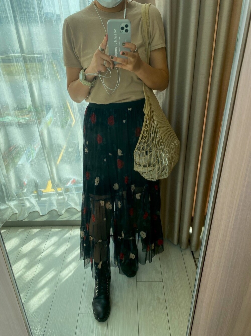 MIKIのスカート「刺繍チュールロングスカート」を使ったコーディネート
